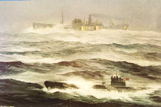 Shortly after the formation of Irish Shipping Ltd. in March 1941 the company chartered two ships from the American government for the duration of the war. West Hematite was taken over at New Orleans in October and renamed Irish Pine. For the next twelve months she carried grain across the Atlantic from Canada. In November 1942 she was bound to Boston and was only two days from there when sighted by U- 608, (Kapitanleutnant Rolf Struckmeier). He followed her for eight hours, frequently losing her in rain and snow squalls. At no stage does he record seeing her neutrality markings. At 7.15 p.m. Zone Time on Sunday 15th November he attacked her. The War Diary records the last moments: